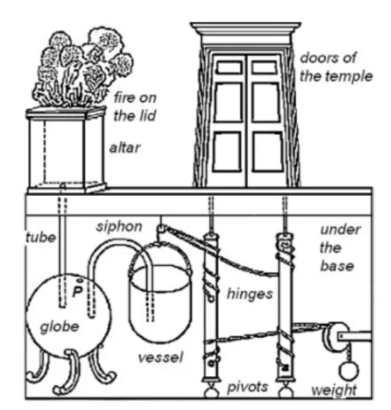 神庙门口点火,火烧水产生蒸汽,蒸汽带动其他机械结构,打开庙门。想象一下,两千年前(大约是汉朝?)的人如果看到这么个自动门,估计当即就觉得神仙显灵了,震撼不是一般的。