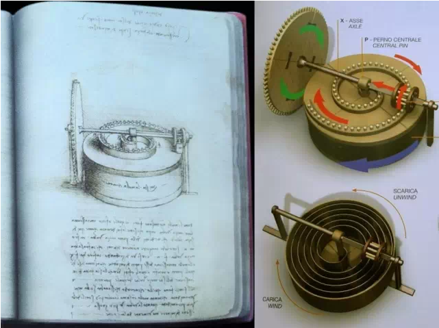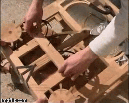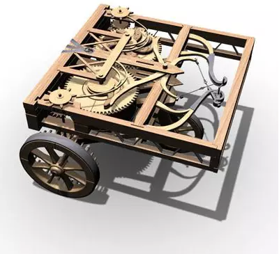 另一位众所周知的、设计过机械的大师就是达芬奇了。下图是达芬奇设计的小车,通过上发条可以自动行驶。