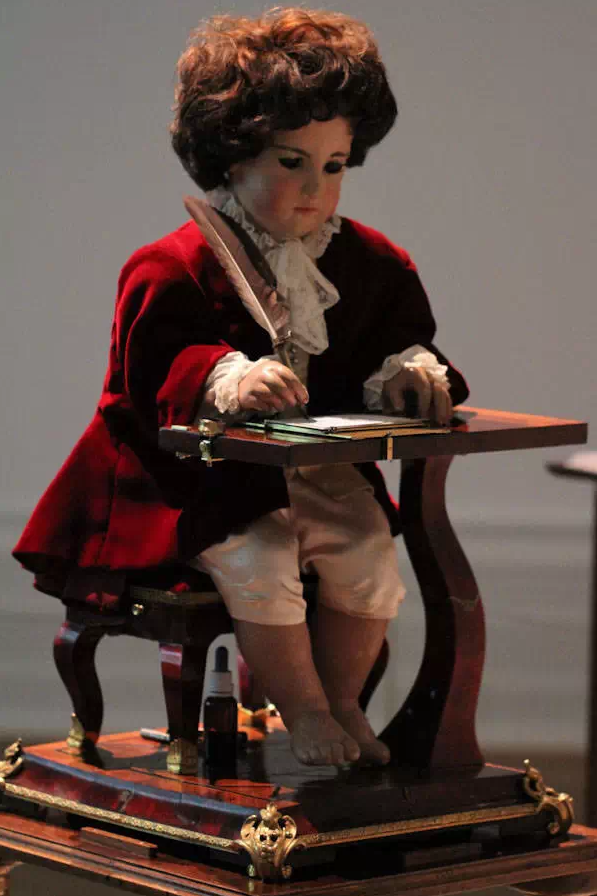 这个会写字的机械人偶被认为是***早的计算机雏形。共计由六千多个部件组成,这个会写字的小男孩人偶用羽毛笔蘸真的墨水写字,而且他写字的内容还是可以“编程”的,不同的机械齿轮会使人偶的手臂做出不同的动作。