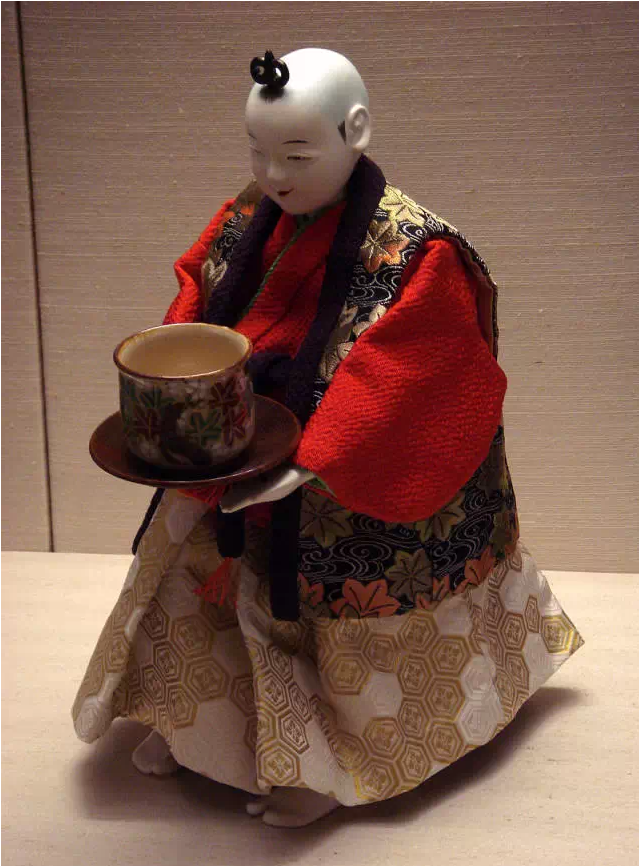 奉茶童子是***典型的日本机关人偶。主人将茶放置于机关人偶双手的碗上,它会自动往客人的方向移动,客人拿杯子和茶托后,奉茶童子会自动停止,客人喝完茶后,把空的杯子放回机关人偶双手的碗上,奉茶童子会返回原来的位置。